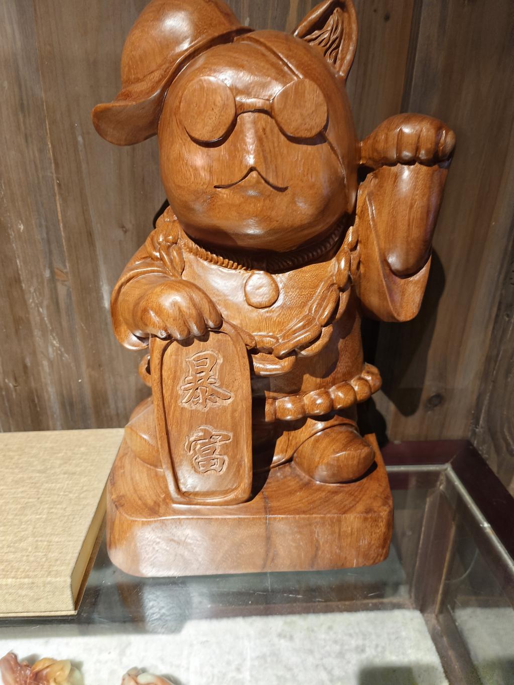 经过与金宁魁先生的交流,成员们了解到,现在的闽侯根雕一是延续传统制作技艺与审美志趣,制作以借料型而为之的仙人、灵兽等形象;另一方面,为了迎合时下的市场需求,也设计制作符合年轻人审美的卡通木雕作品、整板木料的茶桌板桌等实用类器物,以此广开销路。同时,他的工作室也通过“互联网+木根雕”的新兴方式来拓宽销售渠道,宣传推广根雕艺术,让根雕作品走出去。“根雕要表现得再当代一些,应该有当代的精神在里头,让年轻人也看懂并喜爱上传统技艺。”所以金宁魁先生也常将根雕以现代形象的形式雕刻,如《招财猫》、《航空母舰》,《小脑斧》等。
